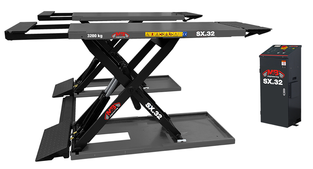 Equipped with adjustable front extensions (L=456 mm) and run-up ramps convertible into extensions (L=267 mm) for a total length of 2,270 mm to reach the lifting points of longer vehicles.