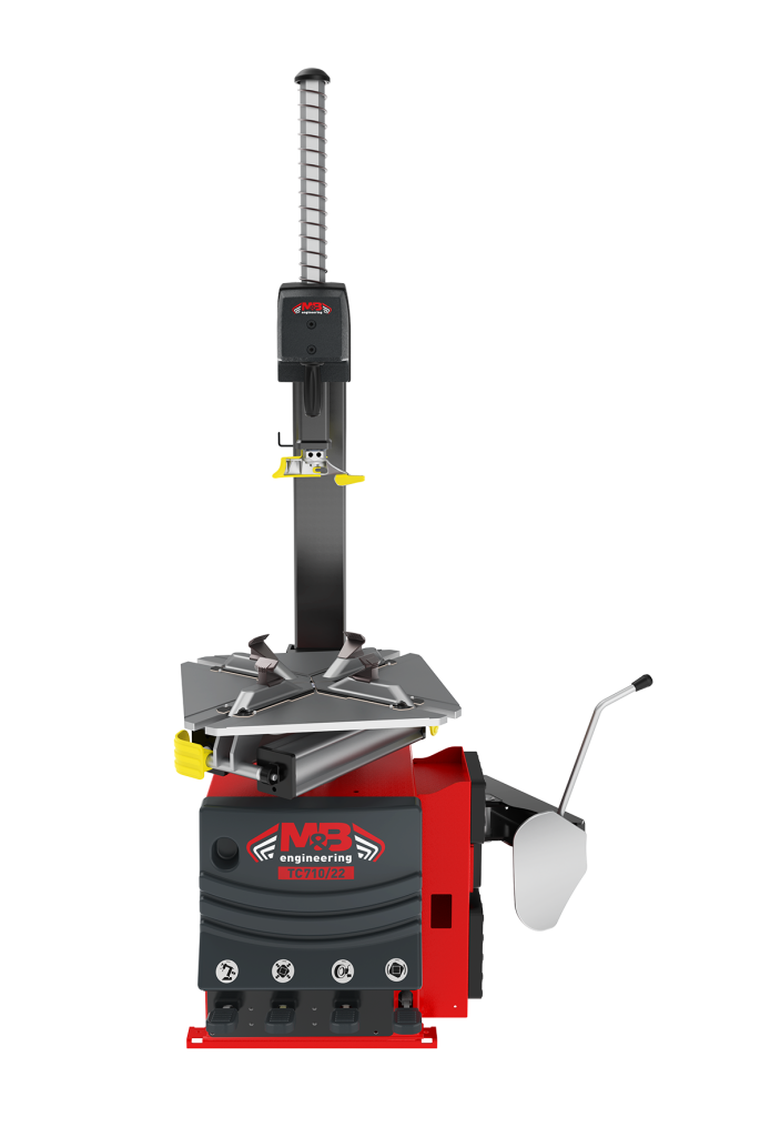41 mm hexagonal vertical arm with device to minimize tolerances and 50×50 mm horizontal arm to reduce flexures in case of Run-flat tyres. Simultaneous vertical and horizontal arm locking system, vertical arm with spring return. Pneumatic rear tilting post granting the maximum rigidity. Square turntable with locking capacity up to 25”. It is equipped with a system with opposing jaws and with two cylinders of Ø 80 mm, guarantees an optimal clamping force on all types of rims. Professional tyre inflating gun with manometer. For a tyre pressure up to max 10 bar. Bead breaker with ergonomic arm to operate on wheels of 12” in width. Removable pedal unit for easy maintenance. Four pedals aligned in the front.